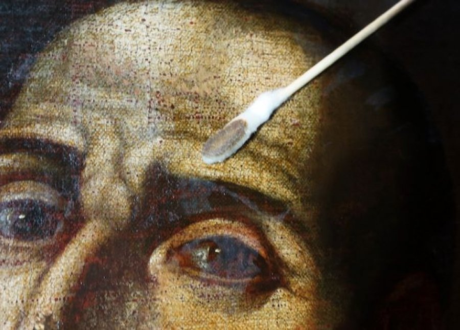 Antes de empezar la intervención, Galán realizó un estudio de flourescencia visible inducida con luz uva que consiste en la toma de fotografías con un foco de luz emisor de radiación ultravioleta, “con la finalidad de poder documentar exactamente la localización de los repintes, así como ver la densidad, antigüedad, el reparto de la capa de barniz presente, rastro de brocha, etc.”, especifica la restauradora.