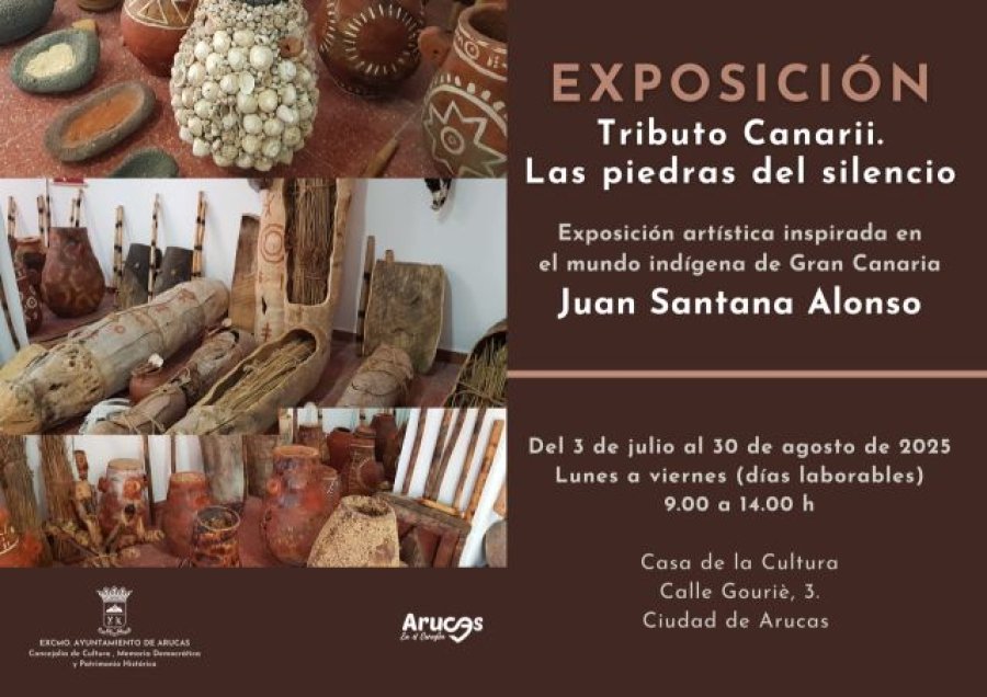 El Ayuntamiento de Arucas, a través de la Concejalía de Cultura, Memoria Democrática y Patrimonio Histórico, expone en la Casa de la Cultura “Tributo Canarii. Las Piedras del Silencio”, una muestra de diversos objetos y materiales inspirada en el mundo indígena de la isla de Gran Canaria.