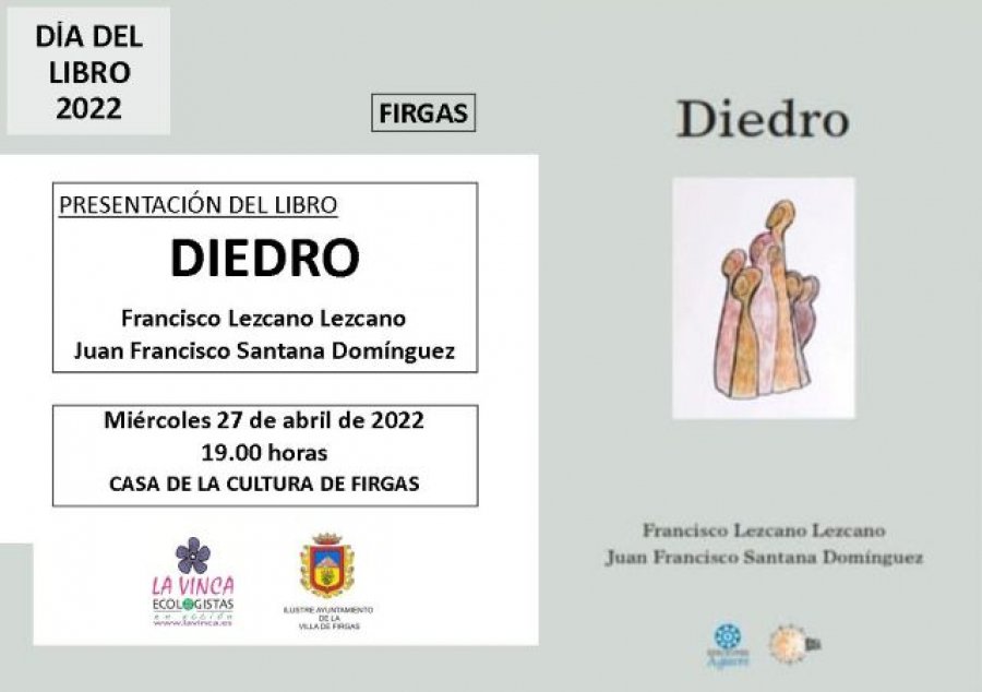 A las 19.00 horas del miércoles 27 de abril de 2022, se procederá a la presentación del libro “DIEDRO” de Francisco Lezcano Lezcano y Juan Francisco Santana Domínguez, en la Casa de la Cultura de Firgas, en un acto organizado conjuntamente por la Concejalía de Cultura del Ayuntamiento de Firgas y el colectivo La Vinca Ecologistas en Acción, con motivo del Día del Libro 2022