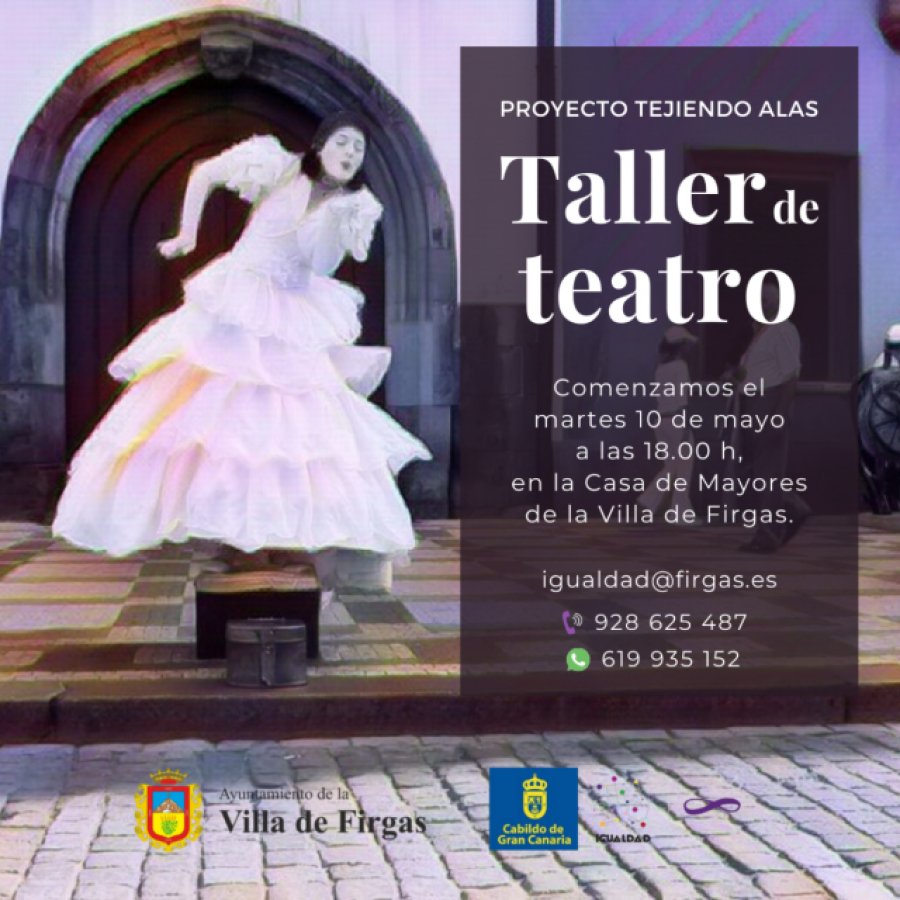 El próximo martes 10 de mayo comienza el Taller de Teatro ‘Tejedoras de Alas’, en la Casa de Mayores de la Villa de Firgas. Cada martes, de 18.00 a 20.00 h, tendrás la oportunidad de descubrir la magia del teatro de la mano de Albano Matos, licenciado en Interpretación