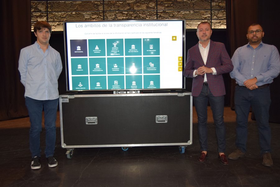 El alcalde de Gáldar, Teodoro Sosa, junto al concejal de Transparencia, Ulises Miranda, y el funcionario municipal adscrito al Servicio de Transparencia, Antonio Pérez, presentó el nuevo Portal de Transparencia desarrollado por el consistorio, tanto para la entidad matriz como para sus entidades dependientes: Galobra, Instituto Municipal de Toxicomanías y Fundación Canaria ‘Ciudad de Gáldar’