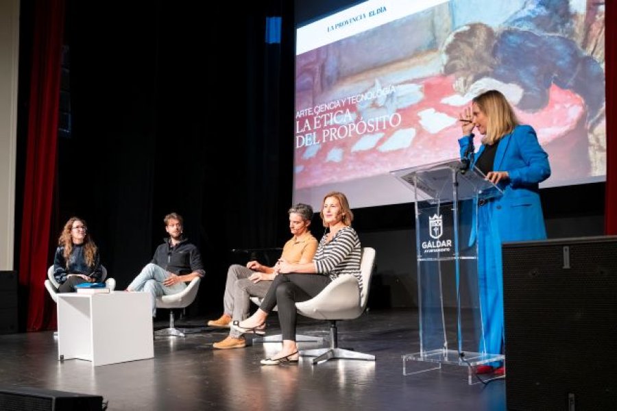 A continuación, se celebró un panel en el que los investigadores y em-prendedores Juan Olvido Perera García (ULPGC), Katya Vázquez Schröeder (ULL), Juan Pedro Calderón Negueroles (AgnosPCB) y Adriana Regidor García, directora de Estrategia de Islas Responsables, reflexionaron sobre cómo articular un propósito común entre disciplinas frente a la complejidad del mundo actual, acotando que pese al avance disruptivo e intimidante de la IA, el arte está a salvo.