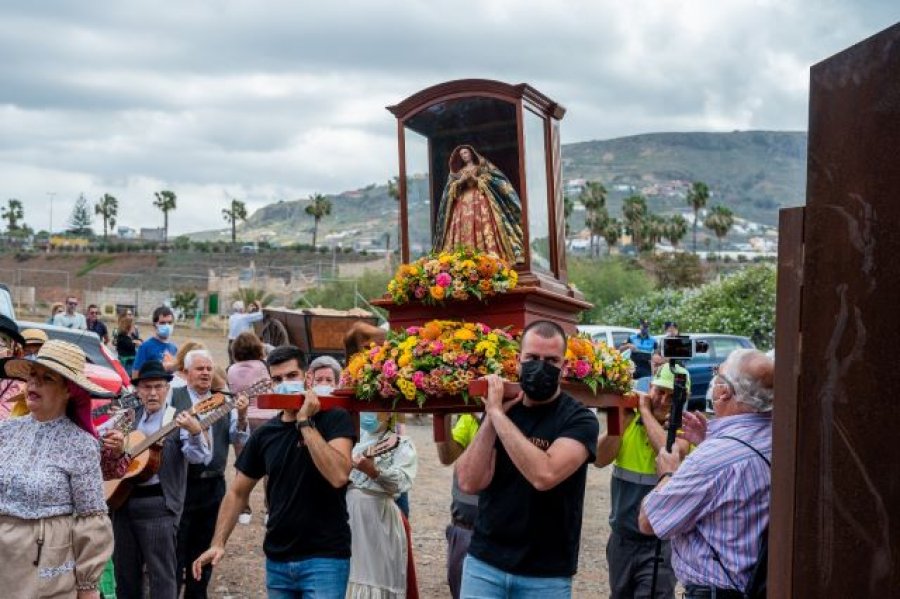 La talla flamenca de pequeñas dimensiones, una pieza artística que fue hace unos años totalmente restaurada gracias a la intervención del Cabildo de Gran Canaria, salió de las Casas Consistoriales para festejar esta celebración y llegó hasta el Barranco Huertas del Rey, donde tuvo lugar la izada de la bandera, entronización de la Imagen y los cantos de coplas de la Virgen para regresar a sus Casas Consistoriales.