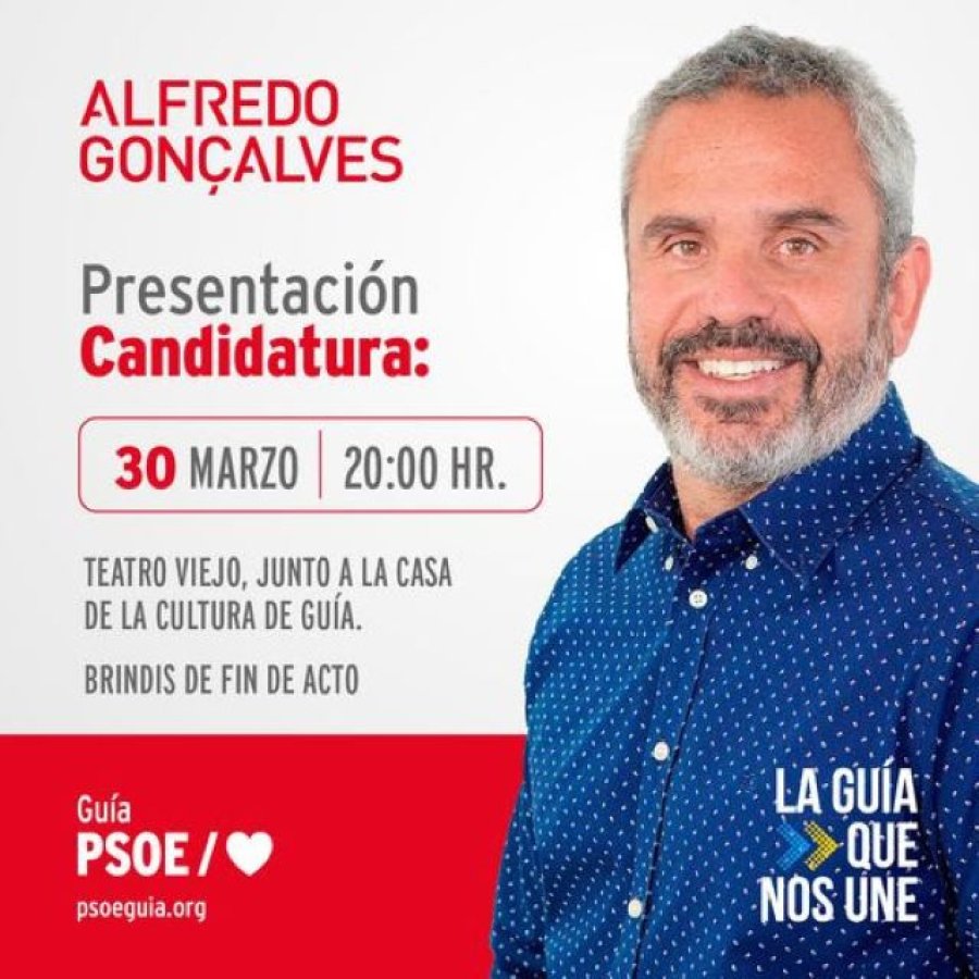 El próximo 30 de marzo de 2023, el PSOE Guía de Gran Canaria tiene el placer de invitarles a la presentación de la candidatura para las próximas elecciones, con Alfredo Gonçalves a la cabeza. El evento tendrá lugar en el Teatro Viejo, junto a la Casa de la Cultura de Guía, a partir de las 20.00h