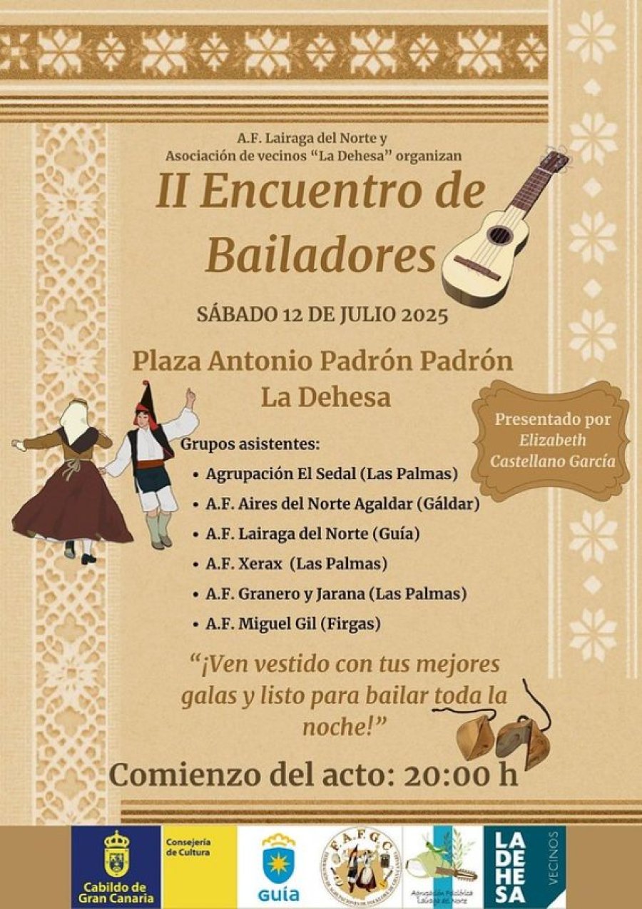La Plaza Antonio Padrón Padrón del barrio guiense de La Dehesa se convertirá este sábado, 12 de julio, a partir de las 20:00 horas, en el escenario del II Encuentro de Bailadores, organizado conjuntamente por la Asociación de Vecinos 'La Dehesa’ y la A.F. Lairaga del Norte.