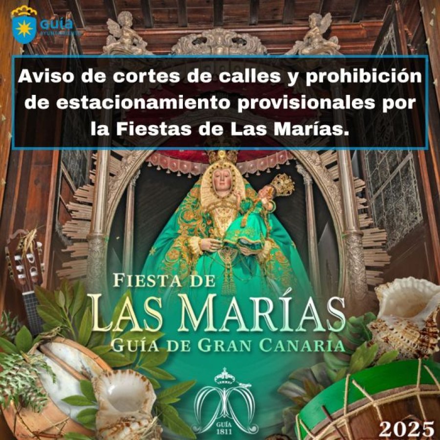 La Policía Local, a través del Ayuntamiento de Guía, informa de que, con motivo de la celebración de la tradicional Fiesta de Las Marías y de la subida de la Virgen de Guía a San Roque, durante este fin de semana se llevarán a cabo cortes provisionales de tráfico y prohibiciones de estacionamiento en distintas calles del municipio