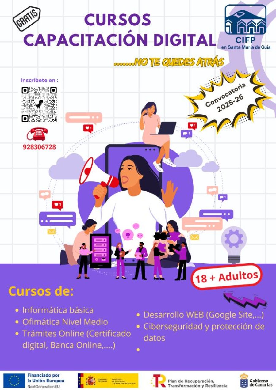 El CIFP en Santa María de Guía ofrecerá en las próximas semanas diversos cursos de Capacitación Digital, dirigidos a personas mayores de 18 años que deseen mejorar sus competencias digitales para la vida diaria, la empleabilidad y la participación social.