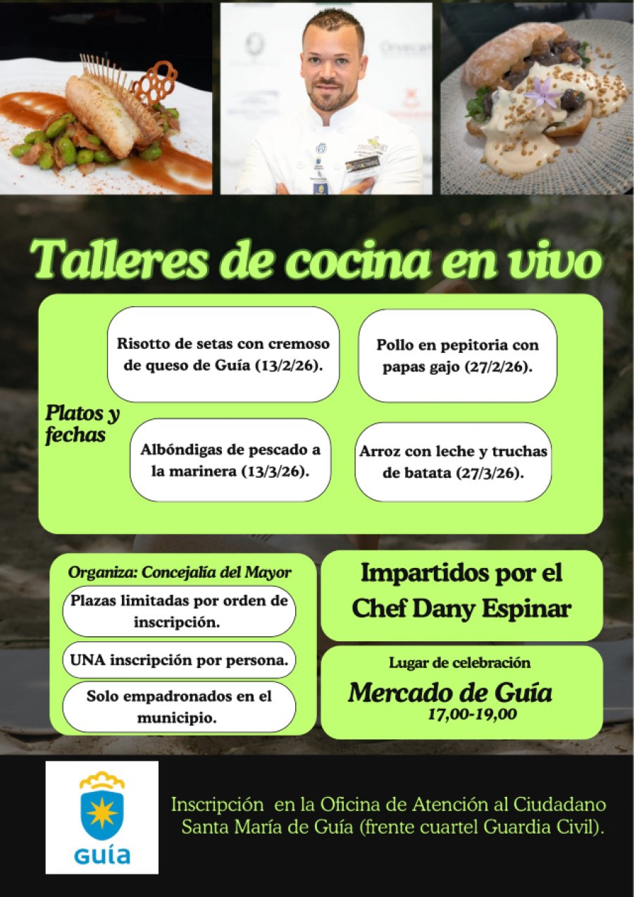 Las personas que deseen participar en los talleres de cocina en vivo para personas mayores que comienzan este viernes 13 de febrero en el Mercado de Guía pueden inscribirse aún en las últimas plazas disponibles para esta actividad organizada por la Concejalía del Mayor que dirige Alejandro Rivero. Para ello pueden dirigirse a la Oficina de Atención Ciudadana, situada frente al cuartel de la Guardia Civil. En estos talleres sólo podrán participar personas empadronadas en este municipio.