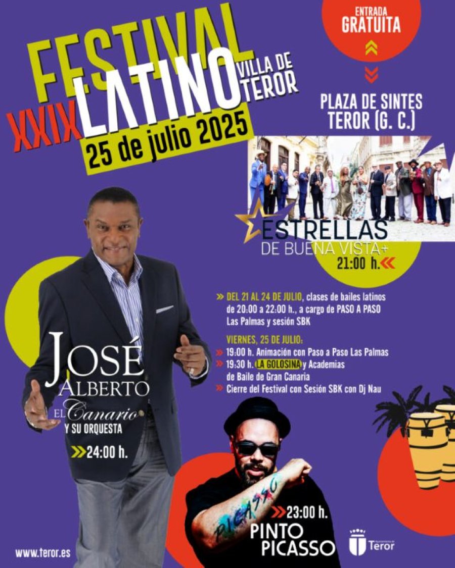 El 29º Festival Latino Villa de Teror arranca este lunes 21 de julio con clases de bailes latinos en la Alameda Pío XII, todas las tardes de la semana hasta el 24 de julio, de 20:30 a las 22:30 horas, impartidas de manera gratuita por Ancor y Ayose Domínguez, de la Academia Paso a Paso Las Palmas, y sesión SBK. El viernes 25 de julio llegará el Gran Concierto del Festival con un cartel de lujo y la presencia del dominicano José Alberto ‘El canario’, todo un referente de la música latina.