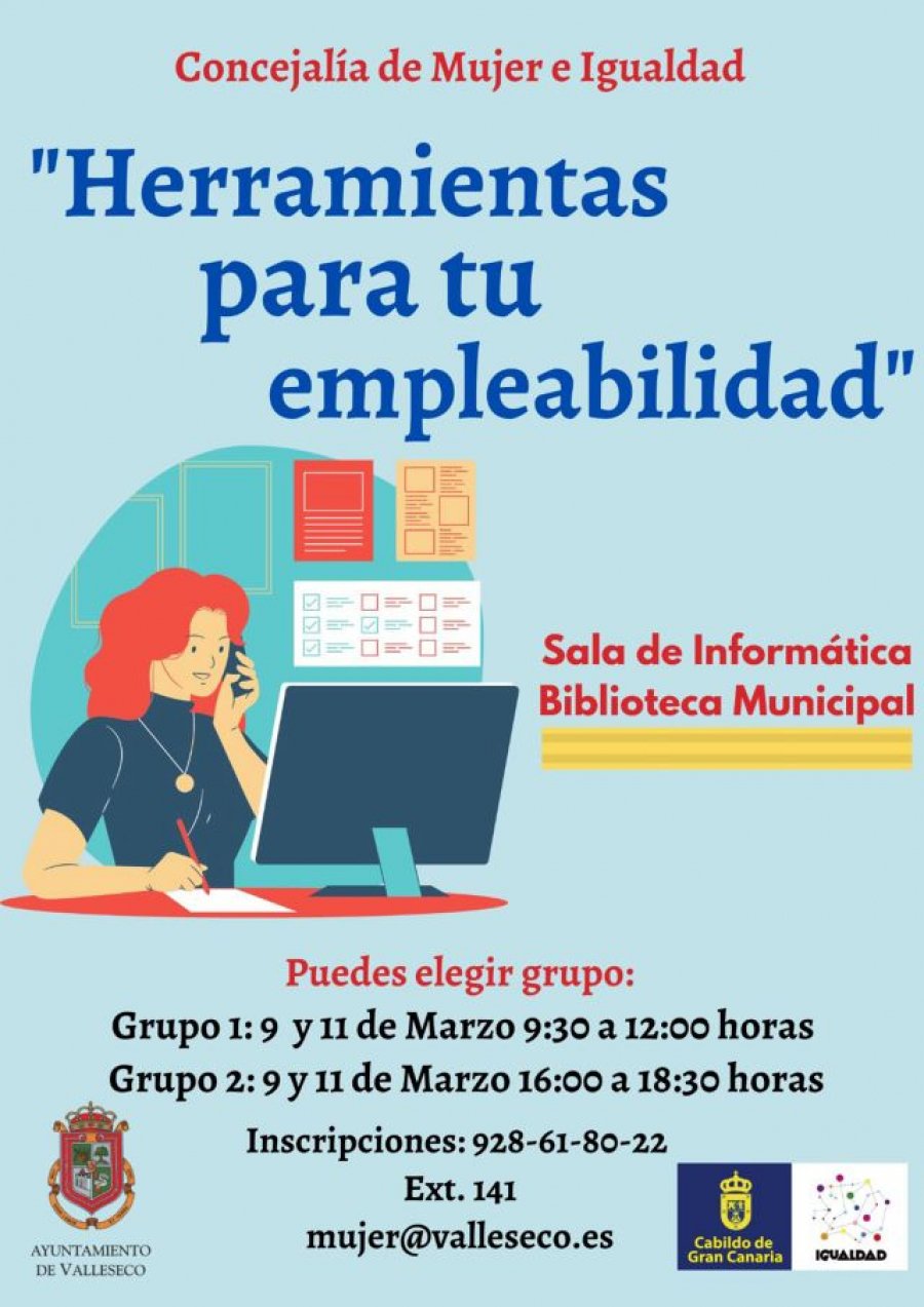 El Área Mujer e Igualdad del Ayuntamiento de Valleseco promueve en el municipio un programa de talleres bajo el lema “Herramientas para tu empleabilidad”, con el objetivo de lograr el empoderamiento de las mujeres a través del incremento y mejora de su empleabilidad, dotándolas de las herramientas y medios necesarios que facilite su integración en el mercado laboral y en la sociedad.