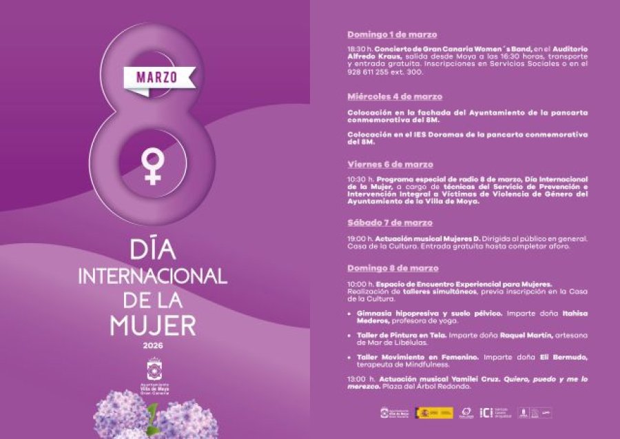 Las actividades arrancan este domingo 1 de marzo con una salida organizada al concierto de la Gran Canaria Women's Band, que tendrá lugar en el Auditorio Alfredo Kraus, una cita que pone en valor el talento femenino en el ámbito musical. El viernes 6 de marzo se emitirá un programa especial de radio bajo el título “8 de marzo, Día Internacional de la Mujer”, a cargo de las técnicas del Servicio de Prevención e Intervención Integral a Víctimas de Violencia de Género del Ayuntamiento de la Villa de Moya, con el objetivo de profundizar en la sensibilización y la prevención. El sábado 7 de marzo, la Casa de la Cultura acogerá la actuación musical de Mujeres D, dirigida al público general y con entrada gratuita hasta completar aforo.