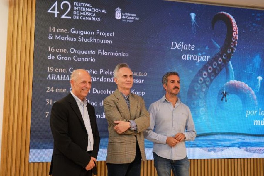 La programación del 42 FIMC arrancará en Fuerteventura el miércoles 14 de enero con el concierto de Guiguan Project ft. Markus Stocknausen en el Palacio de Formación y Congresos, a las 20.30 horas. La formación está integrada por tres músicos que comparten un profundo deseo de desarrollar un estilo único, arraigado en sus raíces isleñas: Javier Infante (guitarra), Alexis Lemes (timple) y Javier Colina (contrabajo). En esta ocasión actuarán con el reconocido trompetista y compositor alemán Markus Stockhausen, uno de los grandes innovadores e improvisadores de la escena jazzística europea. Su colaboración promete llevar esta experiencia musical a nuevas alturas, creando un diálogo enriquecedor entre sus visiones artísticas.
