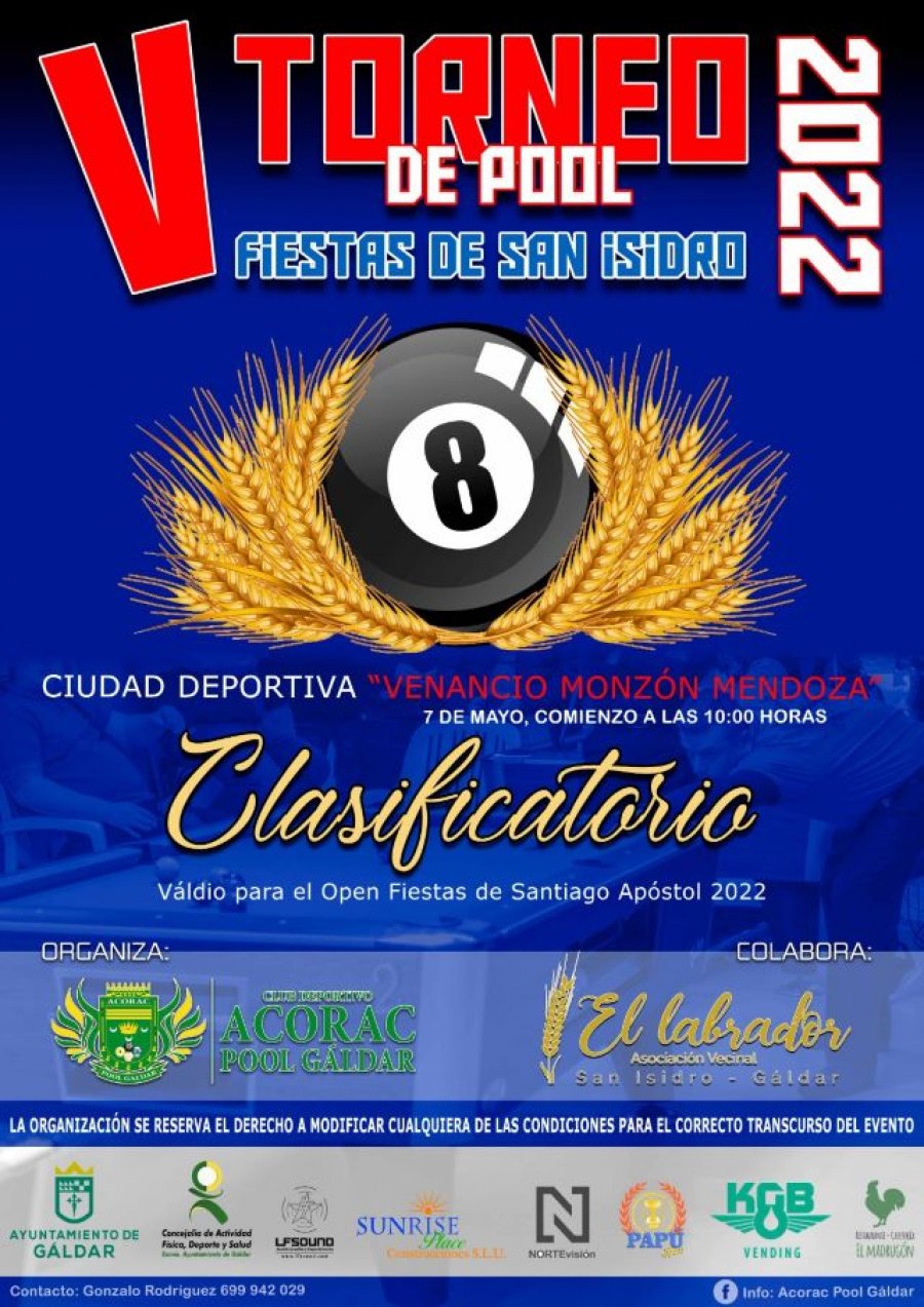Tras cuatro exitosas ediciones anteriores, el Club Acorac Pool Gáldar en colaboración de Concejalía de Deportes y la Asociación Vecinal “El Labrador” de San Isidro te invitan a participar en el V Torneo de Pool de Bola 8 Fiestas de San Isidro Labrador 2022 cuyo objetivo es seguir promoviendo la practica respetuosa de este noble deporte, del cual los seis primeros serán clasificados para el Open de Pool Fiestas de Santiago 2022.