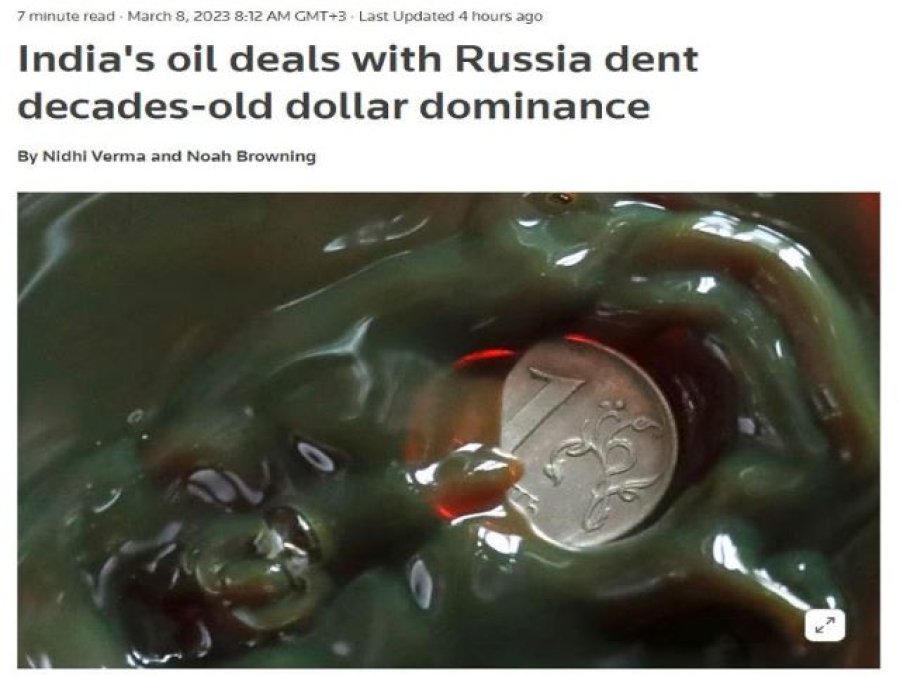 Reuters informó el miércoles que " Los acuerdos petroleros de la India con Rusia abollaron el dominio del dólar por décadas ", lo que informó a su audiencia que la tendencia creciente de que esos dos utilicen monedas nacionales o de terceros como la de los Emiratos Árabes Unidos es algo importante a lo que todos deben prestar atención. Para crédito de ese medio, también recordó a los lectores que la subdirectora gerente del FMI, Gita Gopinath, previó en el mes posterior al especial de Rusia comenzó la operación de que las sanciones de Occidente “podrían erosionar el dominio del dólar”.