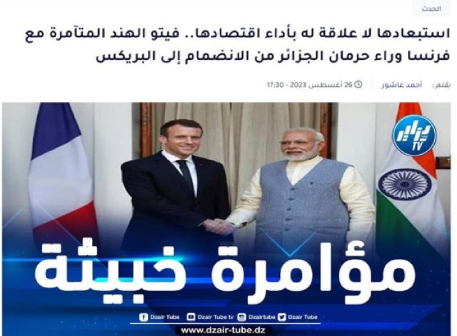 The Cradle llamó la atención el otro día sobre un informe del Dzair Tube de Argelia que citaba fuentes anónimas que alegaban que una conspiración indofrancesa hizo zozobrar el intento de su país de unirse a los BRICS. El resumen del primero se puede leer aquí , mientras que la fuente original en árabe se puede leer aquí . Este popular medio, que cuenta con cinco millones de seguidores en Facebook y, por lo tanto, de ninguna manera es una fuerza mediática marginal en Argelia, retrató a la India como un representante francés y también especuló que también está cumpliendo las órdenes de Israel en los BRICS.