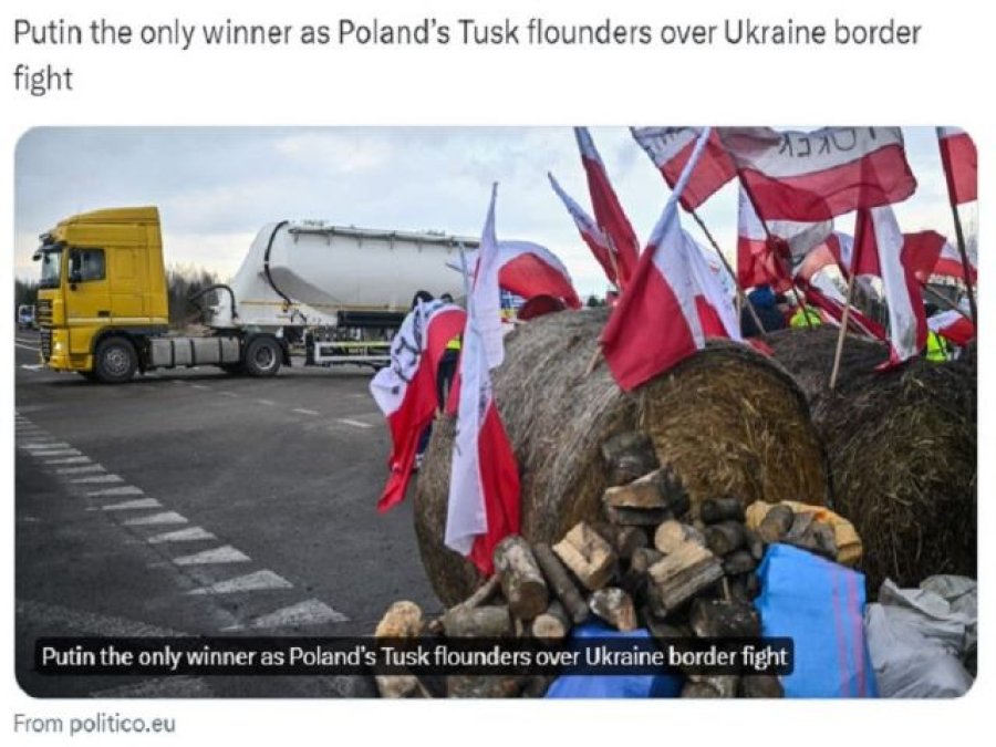 Politico acaba de publicar un artículo afirmando que “ Putin es el único ganador mientras Tusk de Polonia se tambalea en la lucha fronteriza con Ucrania ”, que se produjo después de que “ Ucrania intentó desacreditar a Polonia exagerando su importación de productos agrícolas rusos ”. Antes de ambas provocaciones de guerra de información, el alcalde de Lvov calificó a los agricultores polacos que protestaban como “ provocadores prorrusos ”, a lo que siguió la Agencia de Inteligencia de Defensa de Ucrania alegando que Rusia está explotando las protestas para debilitar el apoyo a Kiev.
