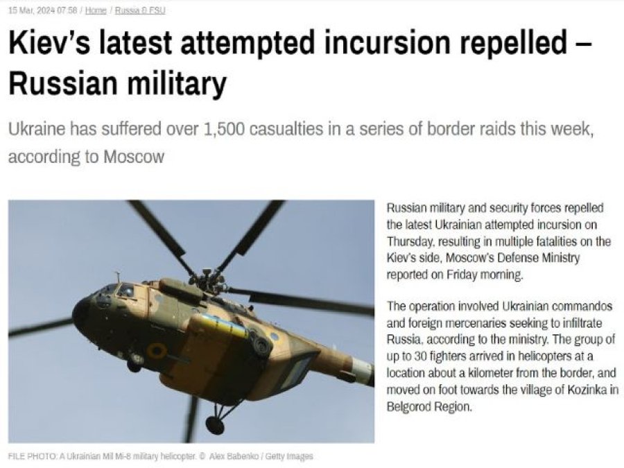 El Ministerio de Defensa ruso confirmó que el último ataque terrorista transfronterizo de Ucrania contra la región de Belgorod, cuyas supuestas imágenes fueron filmadas en realidad dentro de Ucrania a pesar de que algunos de sus combatientes lo hicieron pasar por Rusia, fue un completo fracaso. El presidente Putin ya había evaluado anteriormente que esto se debía a motivos puramente políticos relacionados con influir en las elecciones de este fin de semana, elevar la moral de Kiev y mejorar sus perspectivas de negociación durante las próximas conversaciones de paz .