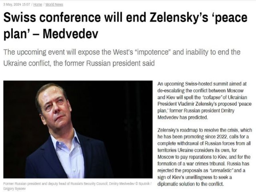 El ex presidente ruso y actual vicepresidente del Consejo de Seguridad, Dmitry Medvedev, enumeró en Telegram tres beneficios que su país espera obtener de las “conversaciones de paz” suizas del próximo mes. Rusia no está invitada a la reunión, que sólo se referirá a los ultimátums de la llamada “fórmula de paz” de Zelensky. Según él, este espectáculo expondrá la vacuidad de los planes de Ucrania, la impotencia de la elite occidental y, en última instancia, no detendrá los avances de su país sobre el terreno.