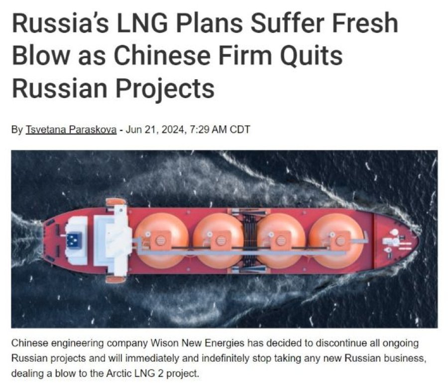 Wison New Energies de China anunció en una publicación de LinkedIn el viernes que detendrá inmediatamente todos sus proyectos rusos "en vista del futuro estratégico de la compañía" luego de la última imposición de sanciones estadounidenses contra la industria del GNL de ese país a mediados de junio. Oilprice.com escribió que esto "asestará un golpe" al proyecto ruso Arctic LNG 2 después de que Wison fuera contratado para construir sus módulos , "que son estructuras masivas prefabricadas que facilitan la rápida construcción de plantas de procesamiento de GNL".
