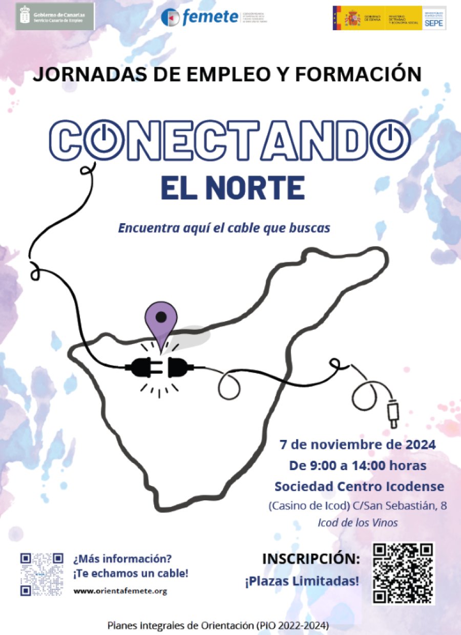 Profesionales en el ámbito del empleo y la formación y representantes del tejido empresarial impartirán charlas informativas sobre distintos aspectos del mercado de trabajo en la Jornada “Conectando el Norte”, que se celebrará este jueves 7 de noviembre de 9 a 14 horas en la Sociedad Centro Icodense (Casino Icod de los Vinos). El encuentro está organizado por los Planes Integrales de Orientación (PIO) 2022-2024 de Femete, que subvencionan el Servicio Canario de Empleo y el Servicio Público de Empleo Estatal (SEPE).