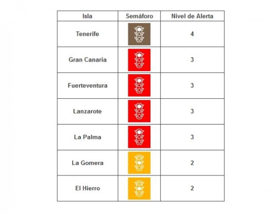 Tenerife continúa en nivel de alerta 4; Gran Canaria, Fuerteventura, La Palma y Lanzarote en nivel 3; y La Gomera y El Hierro en nivel 2. El informe de Salud Pública indica que Gran Canaria continúa en nivel 3, en tanto sus indicadores asistenciales se encuentren entre los valores de ese nivel de alerta, pero se está vigilante a su evolución