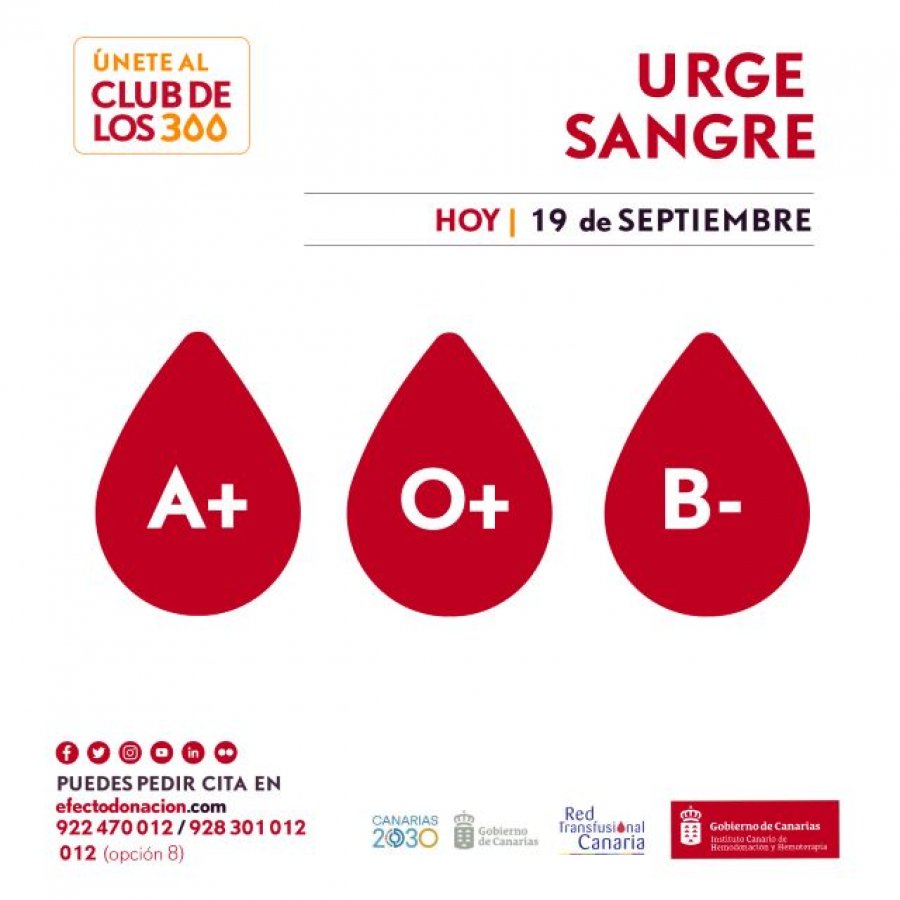 El Instituto Canario de Hemodonación y Hemoterapia, dependiente de la Consejería de Sanidad del Gobierno de Canarias, solicita la colaboración ciudadana y hace un llamamiento urgente a la donación de sangre con el fin de restablecer el stock perdido en los últimos días. Se necesitan donaciones de todos los grupos sanguíneos, especialmente, de A+, O+ y B-.