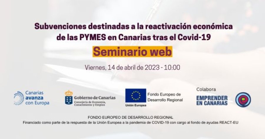La Consejería de Economía, Conocimiento y Empleo del Gobierno de Canarias invita a las pequeñas y medianas empresas del archipiélago a participar en un webinario informativo sobre las nuevas subvenciones para la completa reactivación de las pymes, como parte de la respuesta conjunta de la Unión Europea (UE) a la pandemia de covid-19, con cargo al Fondo de Ayuda a la Recuperación para la Cohesión y los Territorios (React-EU).