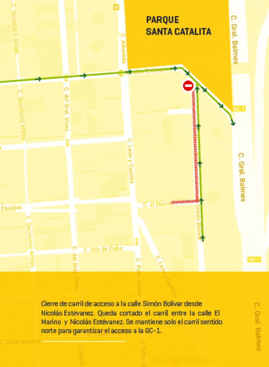 De esta forma, y como ya se había anunciado, los operarios han procedido hoy al cierre de uno de los carriles de la calle Simón Bolívar, entre las vías El Marino y Nicolás Estévanez. El otro vial permanecerá abierto en sentido norte para garantizar el acceso a la GC-1.