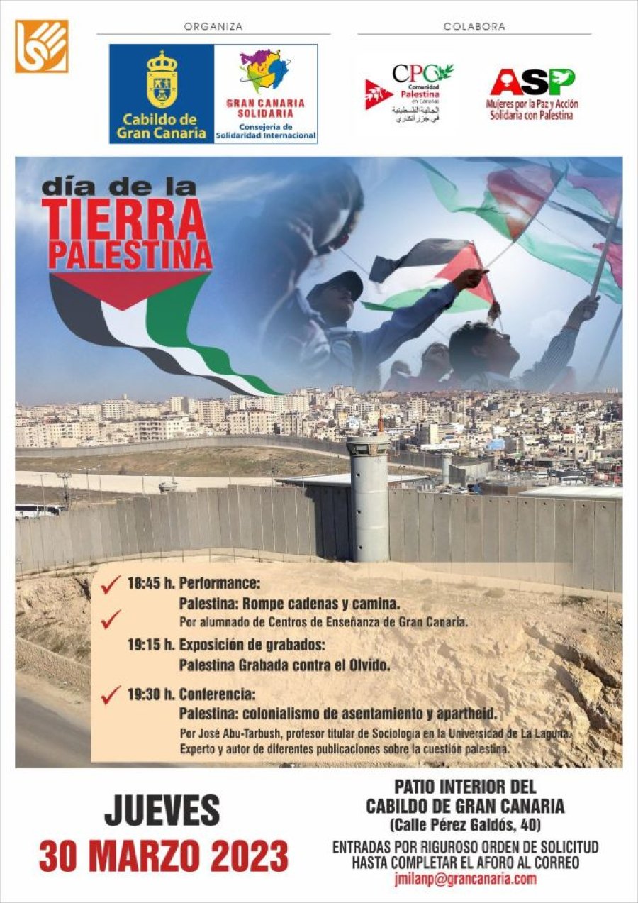 El Cabildo de Gran Canaria conmemora, este jueves, 30 de marzo, el Día de la Tierra Palestina con una exposición de grabados, una representación y una conferencia, con el propósito de recordar el momento en el que a este pueblo le fueron arrebatadas sus tierras y sus posesiones por parte del Gobierno y del Ejército de Israel, así como de analizar las penurias que continúan viviendo hoy las y los palestinos. Los actos se celebrarán, a partir de las 18.45 horas, en el patio interior de su sede central, en la calle Pérez Galdós, 40, de la capital de la Isla.
