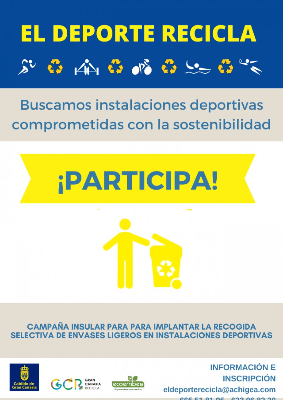 El Servicio de Residuos de la Consejería de Medio Ambiente del Cabildo de Gran Canaria, en colaboración con Ecoembes, ha puesto en marcha la Campaña ‘El Deporte Recicla’, una iniciativa de seis meses de duración cuyo objetivo es facilitar los recursos y apoyos necesarios para que las instalaciones deportivas implanten buenas prácticas ambientales, de cara a reducir la generación de envases ligeros (plásticos, latas y briks) y, en su caso, la separación y recogida selectiva de los mismos
