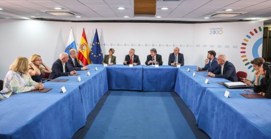El presidente de Canarias, Ángel Víctor Torres, junto con el ministro de Inclusión, Seguridad Social y Migraciones, José Luis Escrivá, y la consejera de Economía, Conocimiento y Empleo, Elena Máñez, han mantenido este lunes 27 de marzo en la sede de Presidencia en Las Palmas de Gran Canaria un encuentro con el presidente de la Confederación Canaria de Empresarios (CCE), Pedro Ortega, el secretario general de UGT Canarias, Manuel Navarro, y la secretaria de Acción Sindical, Igualdad y Juventud general de CCOO, Esther Lidia Martín.