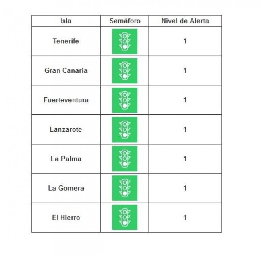Según el informe de Salud Pública, todas las islas se mantienen un riesgo bajo o muy bajo de transmisión del SARS-CoV-2 y desciende la utilización de los servicios sanitarios por coronavirus, por lo que todos los territorios de la Comunidad Autónoma se sitúan en el mismo nivel de alerta (nivel 1), identificado como “semáforo verde”.