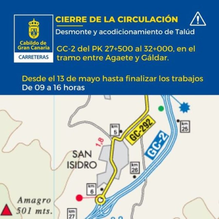 La Consejería de Obras Públicas e Infraestructuras, Arquitectura y Vivienda del Cabildo de Gran Canaria inicia el próximo lunes 13 de mayo los trabajos de desmonte y acondicionamiento del talud situado junto a la GC-2, a la altura de San Isidro, lo que conllevará el cierre en horario de mañana del tramo de la autovía que conecta Gáldar con Agaete