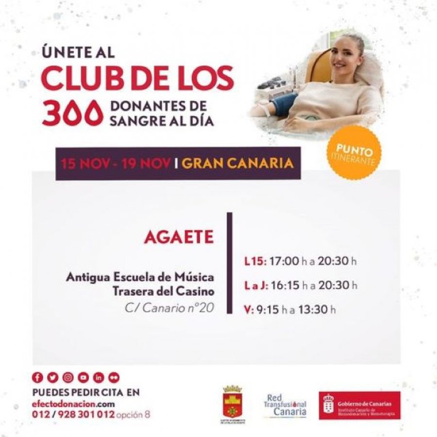 La semana que viene, desde el lunes 15 de noviembre hasta el viernes 19, un equipo de sanitarios de la Red Transfusional Canaria, estará disponible en la sede de la antigua Escuela de Música de Agaete.
