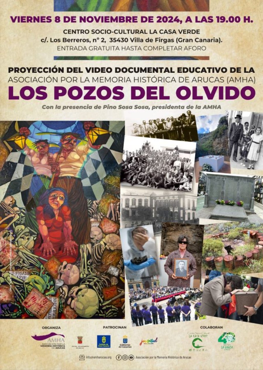 El Centro Socio-Cultural LA CASA VERDE (c/ Los Berreros, nº 2) de la Villa de Firgas acoge el próximo viernes 8 de noviembre de 2024, a las 19.00 horas, la proyección del Documental-Educativo “LOS POZOS DEL OLVIDO” promovido por la Asociación por la Memoria Histórica de Arucas (AMHA), con la colaboración para este acto en Firgas del colectivo La Vinca Ecologistas en Acción, en un acto que contará con la participación de doña Pino Sosa Sosa, presidenta de la AMHA y protagonista del Documental