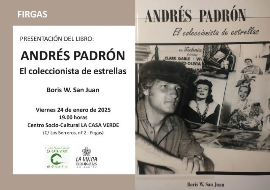 El Centro Socio-Cultural LA CASA VERDE (c/ Los Berreros, nº 2) de la Villa de Firgas acoge el próximo viernes 24 de enero de 2025, a las 19.00 horas, el acto de presentación del libro "Andrés Padrón, el coleccionista de estrellas", de Boris W. San Juan, documentalista e investigador cinematográfico, y en el que estarán, además del autor, el propio Andrés Padrón y el investigador Airam González, encargado de la presentación