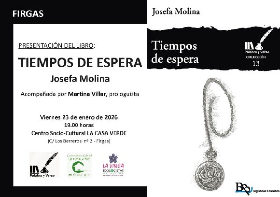 El Centro Socio-Cultural LA CASA VERDE (c/ Los Berreros, nº 2) de la Villa de Firgas acoge el próximo viernes 23 de enero de 2026, a las 19.00 horas, el acto de presentación del libro "TIEMPOS DE ESPERA", de Josefa Molina, en un acto bajo la organización del colectivo La Vinca Ecologistas en Acción y de la Asociación de Escritoras y Escritores Palabra y Verso, en el que acompañará a la autora la escritora Martina Villar, prologuista del libro