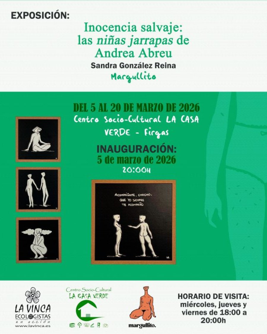 A las 20.00 horas del jueves 5 de febrero de 2026, se procederá a la INAUGURACIÓN en el Centro Socio-Cultural LA CASA VERDE de Firgas, de la Exposición “Inocencia salvaje: las niñas jarrapas de Andrea Abreu”, una interpretación visual de Sandra González Reina -margullito- de la conocida obra narrativa de la escritora tinerfeña, en una muestra promovida por el colectivo La Vinca Ecologistas en Acción, con motivo del Día Internacional de la Mujer 2026