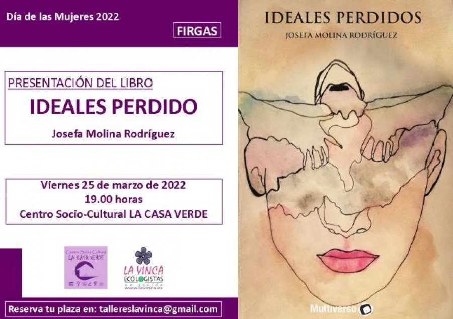 El Centro Socio-Cultural LA CASA VERDE (c/ Los Berreros, nº 2) de Firgas acoge el próximo viernes 25 de marzo de 2022, a las 19.00 horas, el acto de presentación de la novela “IDEALES PERDIDOS”, de la escritora Josefa Molina, bajo la organización de La Vinca Ecologistas en Acción, dentro de la programación de actos desarrollados con motivo del Día Internacional de las Mujeres 2022