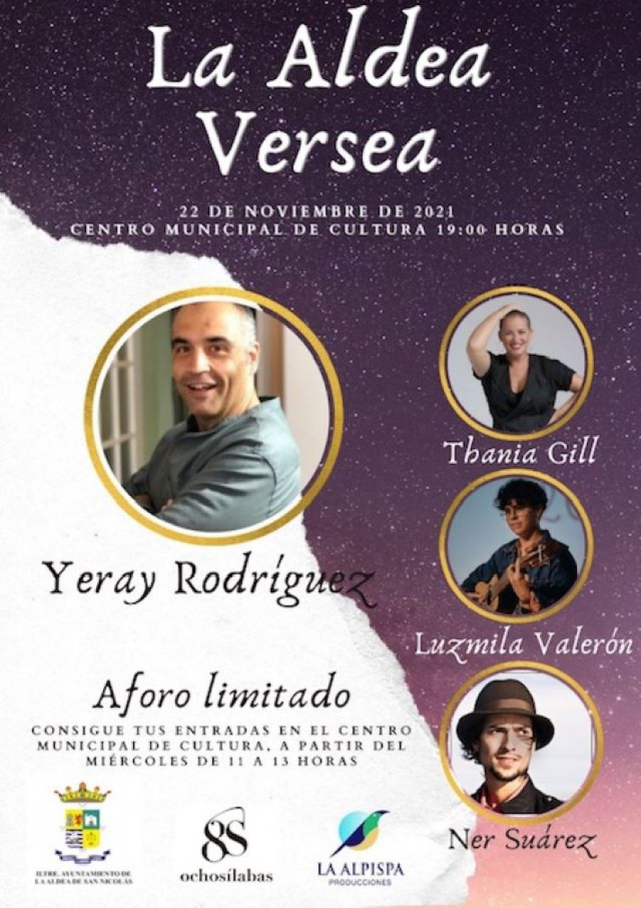 ‘La Aldea versea’ contará con la participación de Yeray Rodríguez, Luzmila Valerón, Thania Gil y Ner Suárez. Será un acto con aforo limitado y las entradas podrán retirarse de forma anticipada en el recibidor del Centro Municipal de Cultura a partir del miércoles, 17 de noviembre, en horario de 11.00 a 13.00 horas.
