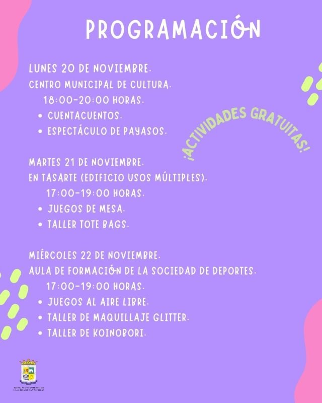 Así, el lunes 20 de noviembre, de 18:00 a 20:00 horas, en el Centro Municipal de Cultura, tendrá lugar un cuenta cuentos y un espectáculo de payasos.