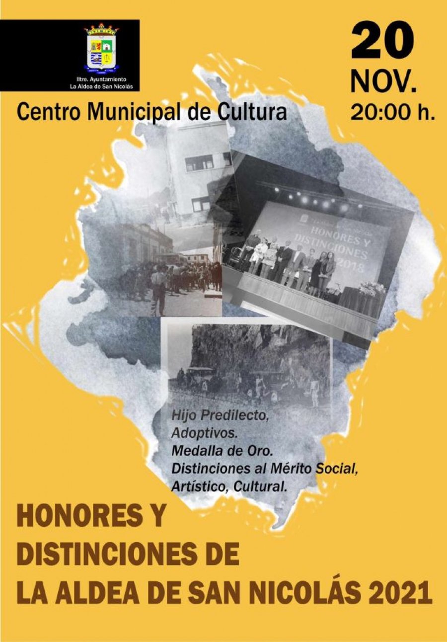 El próximo sábado 20 de noviembre se celebrará en el Centro Municipal de Cultura, a partir de las 20.00 horas, el acto institucional de Honores y Distinciones de La Aldea de San Nicolás 2021. Este evento se vio interrumpido el año pasado debido a la pandemia de la COVID-19.
