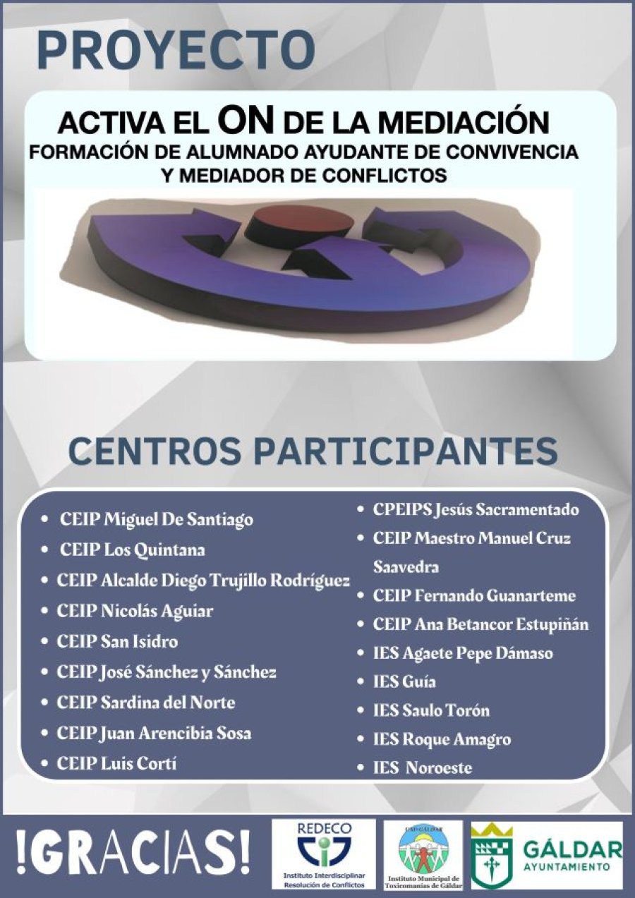 El proyecto de 'Activa el ON de la mediación: Formación de alumnado ayudante de convivencia y mediadores de conflictos', de Redeco e impulsado por el equipo de Prevención de la Concejalía de Prevención de Adicciones del Ayuntamiento de Gáldar, que dirige Rafael Pérez Mateo, dentro de su plan de acciones en el ámbito educativo, enmarcado en las directrices del IV Plan Canario sobre Adicciones, ha finalizado después de haber llegado a 360 alumnos y alumnas