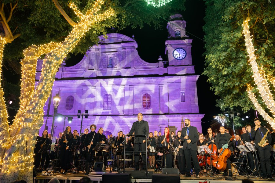 La Banda Municipal de Música de la Real Ciudad de Gáldar maravilló en su concierto extraordinario de Navidad, una cita que tuvo lugar este sábado en la Plaza de Santiago y que resultó histórica ya que por primera vez superó los 100 componentes