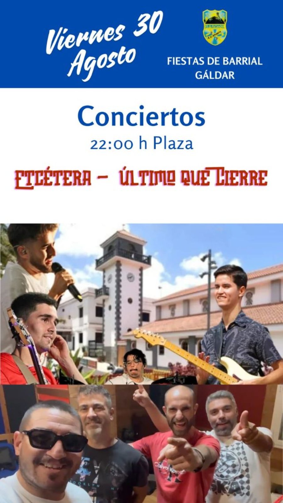 La programación de las fiestas continua de la siguiente manera, para la jornada del viernes treinta de agosto, en la Plaza José Rodríguez Quintana a las 22:00h. concierto por los grupos: Etcétera y El Último que Cierre.
