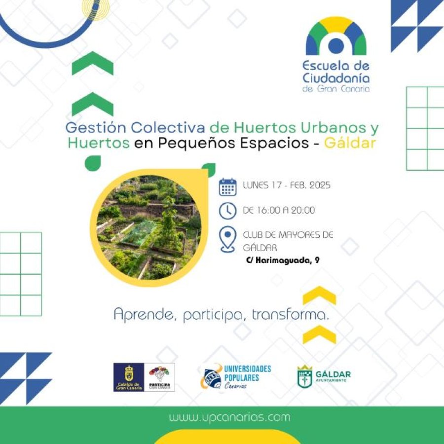 El Ayuntamiento de Gáldar, a través de la Concejalía de Educación, colabora en el taller de la Escuela de Ciudadanía de Gran Canaria sobre gestión colectiva de huertos urbanos y huertos en pequeños espacios que tendrá lugar el lunes 17 de febrero de 16.00 a 20.00 horas