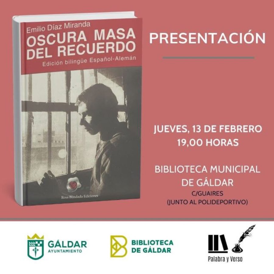 La Biblioteca de Gáldar acoge este jueves 13 de febrero la presentación del poemario ‘Oscura masa del recuerdo’, de Emilio Díaz Miranda, activista contra la dictadura de Franco y cofundador del Sindicato Comisiones Obreras en las Islas Canarias.