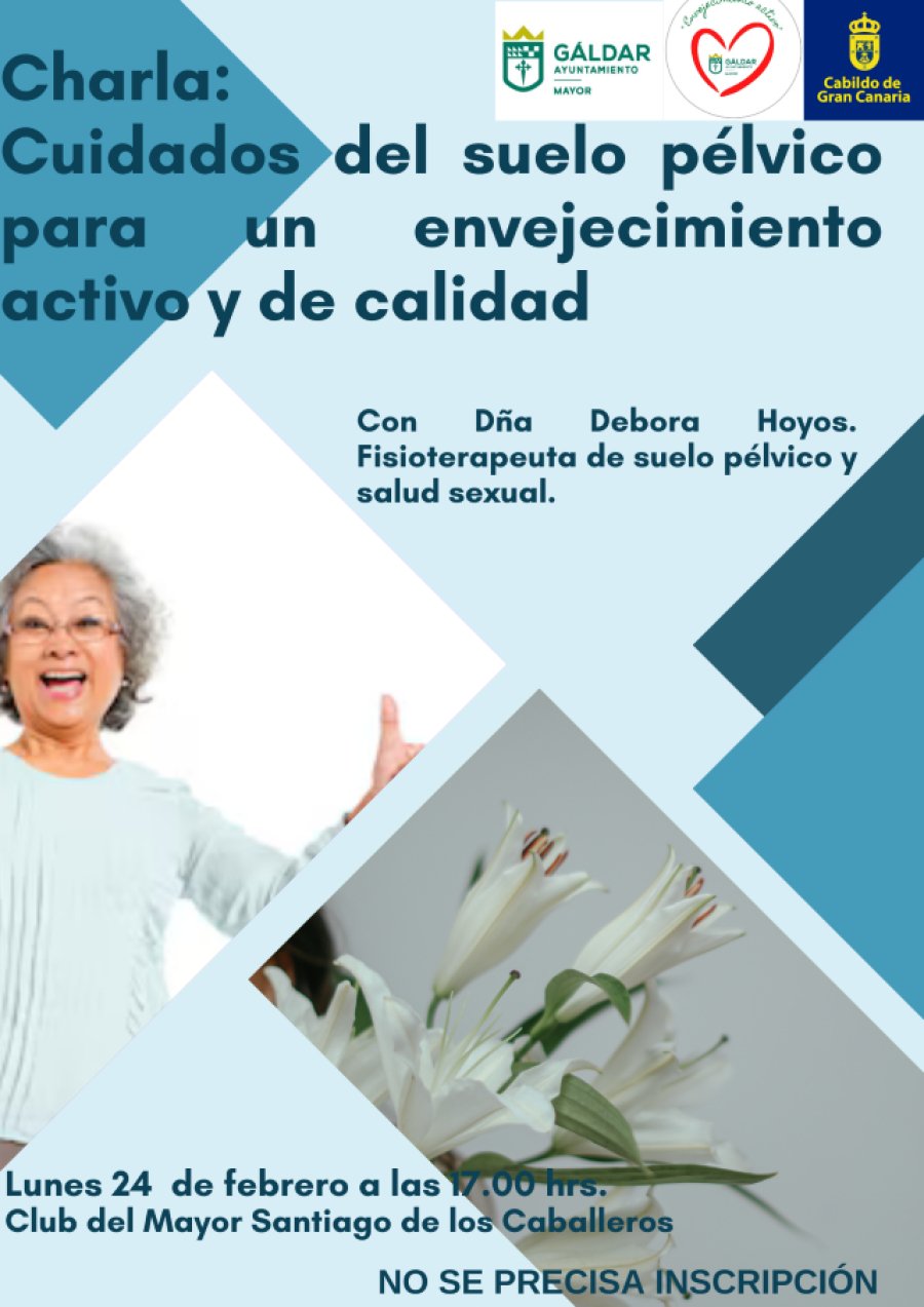 El proyecto Envejecimiento Activo de la Concejalía del Mayor del Ayuntamiento de Gáldar, coordinado por Dolores Delgado Jorge, organiza una charla titulada 'Cuidados del suelo pélvico para un envejecimiento activo y de calidad', impartida por la ponente Debora Hoyos el día 24 de febrero a las 17.00 horas