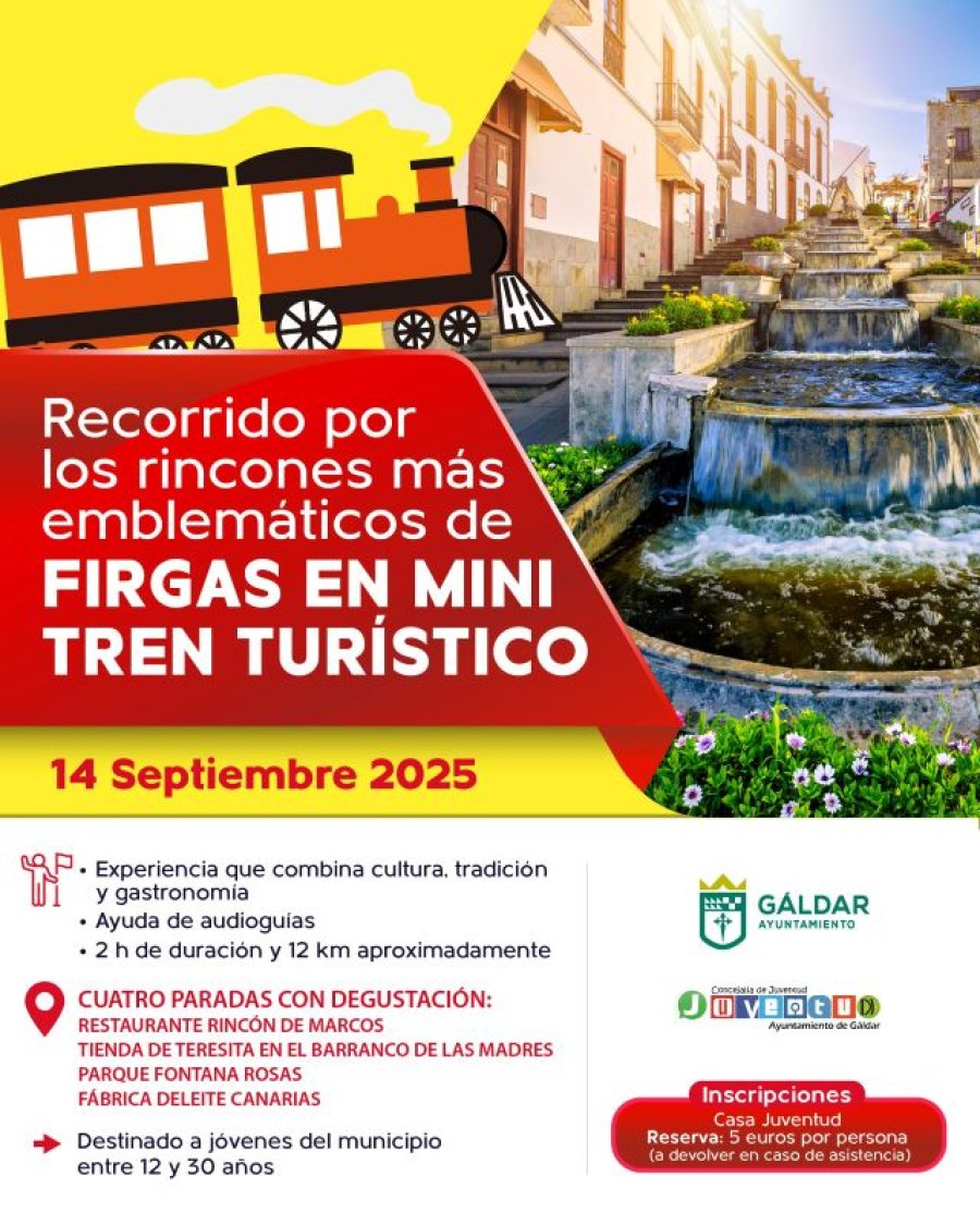 La actividad consiste en recorrer los rincones más emblemáticos de Firgas en mini tren turístico, una experiencia que combina cultura, tradición y gastronomía en un recorrido de aproximadamente dos horas de duración y 12 kilómetros, con la ayuda de audioguías que contarán la historia y las curiosidades del municipio conocido como la 'Villa del Agua'.
