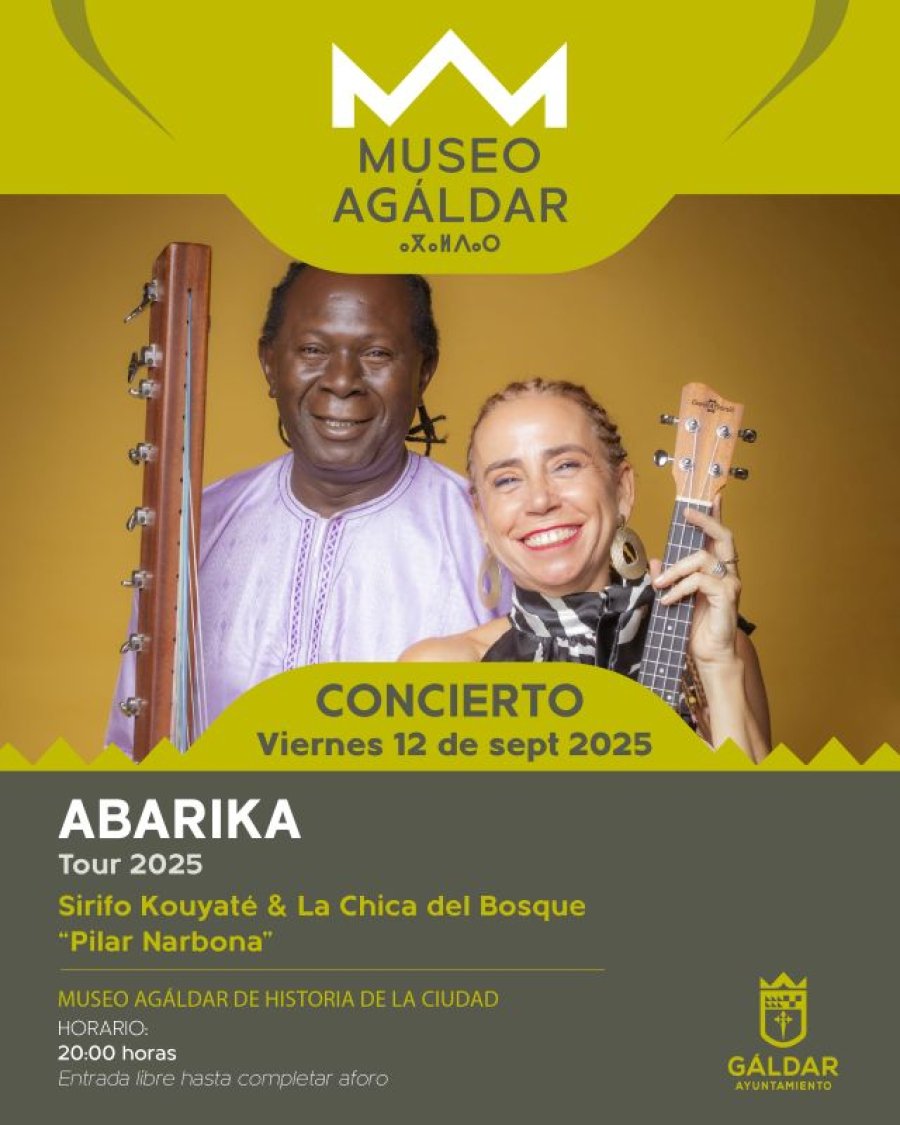 El próximo viernes 12 de septiembre, a las 20:00 horas, el Museo Agáldar de Historia de la Ciudad será escenario del concierto 'Abarika', un espectáculo que propone un viaje sonoro entre África Occidental y Andalucía, a cargo de los artistas Sirifo Kouyaté y Pilar Narbona, conocida como La Chica del Bosque